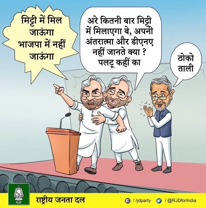 राष्ट्रीय जनता दल के अध्यक्ष लालू प्रसाद यादव के आधिकारिक ट्विटर हैंडल से एक ट्वीट किया गया है जिसमें सीएम नीतीश कुमार को ‘पलटूबाज’ बताया गया है। लालू यादव के ट्विटर ट्विटर हैंडल पर लिखा कि नीतीश को खुद नहीं मालूम कहां-कहां, कब-कब, क्यों, कैसे और किसलिए पलटियां मारी है। लालू यादव के ट्विटर हैंडल पर एक कार्टून भी शेयर किया गया है। जिसमें सीएम नीतीश कुमार को एक पोडियम पर खड़े होकर यह कहते हुए दिखाया गया है कि मिट्टी में मिल जाऊंगा, भाजपा में नहीं जाऊंगा। पीछे से एक दूसरे नीतीश कुमार को पहले वाले नीतीश कुमार को पकड़ते हुए दिखाया गया है। जिसमें वे पहले वाले नीतीश कुमार को समझाते हुए कहते हैं कितनी बार मिट्टी में मिलाएगा, अपनी अंतरात्मा और डीएनए नहीं जानते क्या? पलटू कहीं का.’ वहीं पीछे से एक तीसरा आदमी जो कि सीएम नीतीश कुमार ही है, वह ‘ठोको ताली’ कहते हुए ताली बजाते हुए दिख रहे हैं।